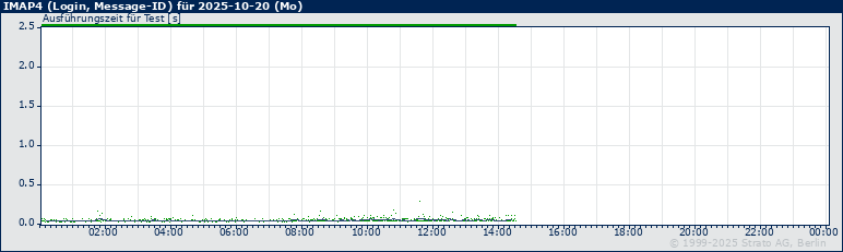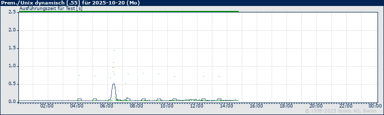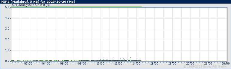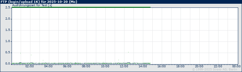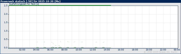 Am 2025-10-20 traten keine Timeouts/Fehler auf. Antworten, die erst nach 10 oder mehr Sekunden eingetroffen sind, sind auf der oberen X-Achse durch eine orange, Timeouts oder Fehler als graue Markierung hervorgehoben. Timeouts sind zusätzlich als vertikale graue Linie im Graph dargestellt.