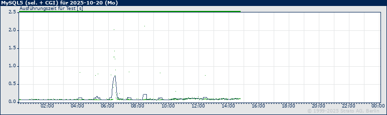 Im folgenden Graph geben blaue Punkte geben die Antwortzeit bei den einzelnen Messungen an, eine mehr order weniger horizontal verlaufende, graue Linie zeigt den gleitenden Durchschnitt für 15 Minuten an. Ein Pixel in der Fläche des Graphen (weiß) entspricht zwei Minuten bzw. Messungen.